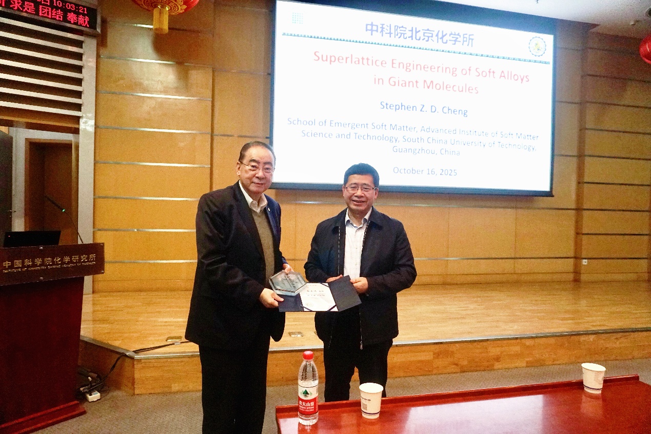 2025年10月16日,化学所名誉教授、华南理工大学、阿克伦大学程正迪教授访问化学所,并作题为“Superlattice Engineering of Soft Alloys in Giant Molecules”的分子科学论坛报告。所长王树研究员为程正迪教授颁发了“分子科学论坛”荣誉证书和奖牌,董侠研究员主持讲座。
