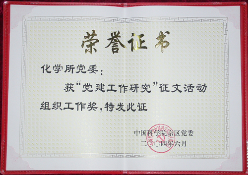 随着当前形势和任务的变化,基层党的建设和工作中面临许多新情况、新问题,为了进一步加强党建工作的研究和交流,京区党委在上半年开展了“党建工作研究”征文活动,充分发挥党建研究工作对实际工作的推动作用。化学所党委认真组织、积极参与,有十余名同志踊跃投稿,受到了京区党委的表彰,被京区党委评为“组织工作奖”。黄丽荣同志撰写的“ 做好党建工作是研究所顺利改革与发展的保证”被评为“优秀奖”。