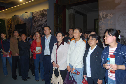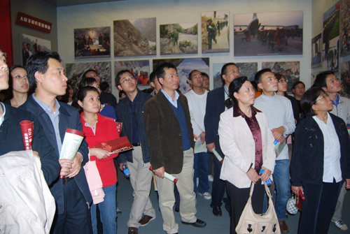 展览大厅入口处是一座表现救援人员在废墟中营救被困群众的大型雕塑,使党员们不禁想起面对突如其来的特大地震灾害,全党全军全国各族人民在党中央、国务院和中央军委坚强领导下所展开的气壮山河的抗震救灾斗争。跟随着讲解员的介绍,党员们走进展厅,仔细观看展厅展出的声像、照片、实物等展品,深深为一幕幕感人肺腑、催人泪下的场景所感动。