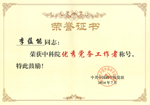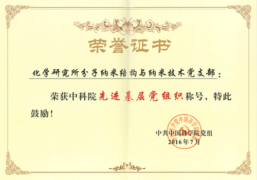 化学所分子纳米结构与纳米技术党支部获得中国科学院先进基层党组织荣誉称号。李蕴能同志被评为中国科学院优秀党务工作者。