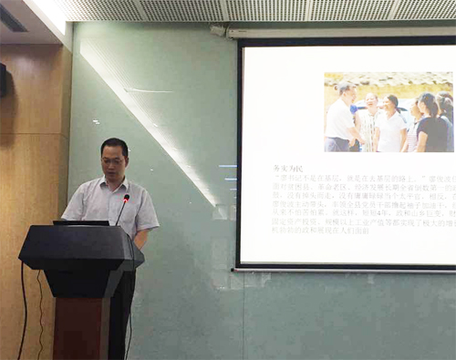 党支部书记钟羽武同志首先宣读了《中共中国科学院党组转发中共中央组织部关于认真学习贯彻习近平总书记重要指示精神广泛开展向廖俊波同志学习的通知》和《中共中国科学院党组关于认真学习贯彻习近平总书记重要指示深入开展向黄大年同志学习活动的通知》,并号召广大党员“学习他们热爱祖国、胸怀大局的情怀;学习他们脚踏实地、苦干实干的精神;学习他们立足岗位、奋发有为、敢于担当的品格”。随后他作了“学习先进典型,弘扬担当精神”主题报告,向大家详细介绍了廖俊波同志、黄大年同志的生平及他们的先进事迹。
