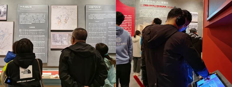 一首首耳熟能详的革命歌曲——国际歌、沂蒙山小调、山丹丹开花红艳艳、黄河大合唱、义勇军进行曲等不断在耳边响起,现场的很多党员同志或戴上耳机聆听或自己低声哼唱,每一首旋律都在带领大家穿透时空去感受当年共产党带领人民英勇抗争的艰辛岁月,这些革命歌曲创作和流传在战争岁月起到了鼓舞人心、激发斗志的作用。
