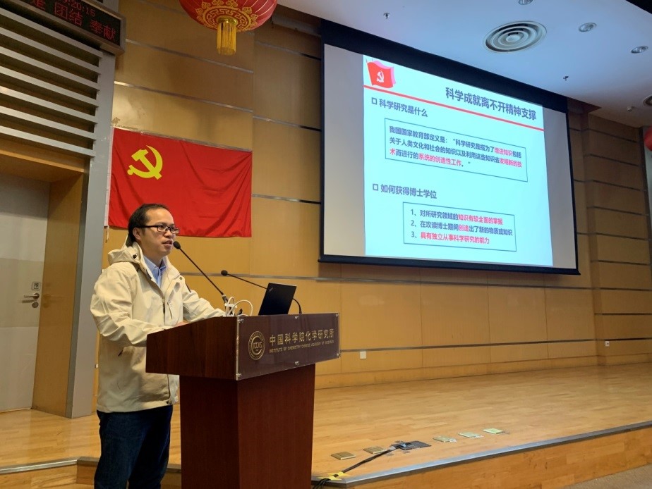 习近平总书记指出:“科学成就离不开精神支撑。科学家精神是科技工作者在长期科学实践中积累的宝贵精神财富。”会上,青年党员、学术骨干付年凯研究员以“心怀感恩,不懈奋斗——学习科学家精神”为题讲党课,详细阐述了什么是科学家精神、科学研究是什么等问题,并围绕“团结协作,互相学习”、“实事求是,有担当”、“不忘初心,学无止境”三个方面,结合我国老一辈科学家的感人事迹以及自己的科研成长经历与感悟,向全体与会者分享如何在科研工作中传承和弘扬科学家精神。