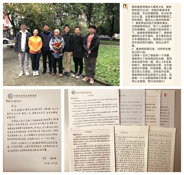 党支部在庆祝建所65周年之际,以“创新、求是、团结、奉献”的化学所所训精神为出发点,以塑造和弘扬新时代科学家精神为主旨,重点在科研骨干、青年党员、预备党员、入党积极分子群体中开展了“给老科学家写一封信”活动,并拜访了实验室老科学家代表谢择民研究员。