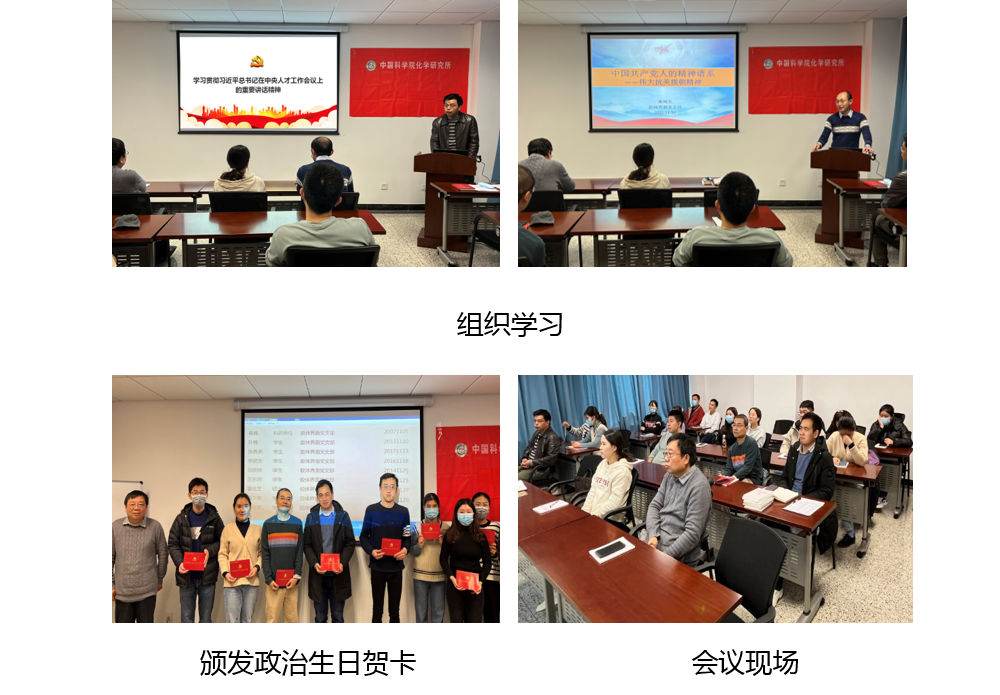 2021年11月30日,胶体界面党支部召开支部大会,组织学习贯彻习近平总书记在中青年干部培训班开班式上的重要讲话精神、习近平总书记在中央人才工作会议上的重要讲话精神以及伟大抗美援朝精神。