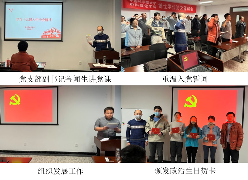 会上,按照党员组织发展程序,组织委员范雅珣同志主持了预备党员董博同志的转正工作,与会党员一致同意董博同志按期转为正式党员。党支部书记费进波同志和副书记鲁闻生同志为入党时间在12月份的党员颁发化学所党委精心准备的政治生日贺卡。全体党员面对党旗重温入党誓词,旨在激励各位党员同志严格要求自己,牢记入党初心,增强党员的使命感和责任感,坚定为共产主义事业而奋斗终身的信心和决心。
