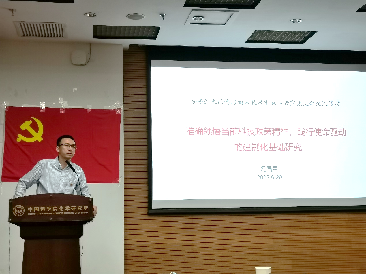 为热烈庆祝中国共产党成立101周年,持续推动党建工作与科技创新工作深度融合,进一步加强党员廉政教育,按照化学所党委关于“基层组织建设见成效”活动部署要求,分子纳米结构与纳米技术党总支于2022年6月29日召开全体党员大会,邀请化学所纪委书记冯国星作“对标使命定位 明确努力方向”主题报告。会议由党总支副书记蒋礼主持。