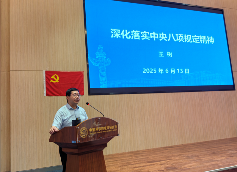 王树首先作了题为《深化落实中央八项规定精神》的专题报告,围绕中央八项规定这一全面从严治党的重要制度成果,从出台的历史背景、精神内涵和时代价值三个方面进行了系统讲解,详细解读了中央八项规定、中央八项规定精神及其实施细则的核心要义,并重点介绍了化学所以“学思想、强作风、促攻坚”为主线,开展深入贯彻落实中央八项规定精神的具体举措。随后,王树做抢占科技制高点工作思路报告,解读了中国科学院关于抢占科技制高点的战略部署,并结合化学所实际提出的具体工作方案,详细介绍了化学所在抢占科技制高点工作方面的组织开展情况和主要进展。他指出,有机固体实验室在承担重大科研任务和产出重大成果方面拥有深厚积淀,党员同志要传承和弘扬实验室老一辈科学家勇担重任、攻坚克难的精神,结合“深化党纪学习教育,严明岗位工作纪律”专项工作,深刻把握国家战略科技力量的使命定位,始终保持勇攀科技高峰的创新激情,为实现高水平科技自立自强贡献智慧和力量。