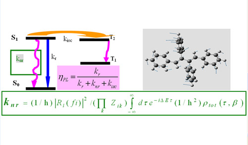 理论预测分子的荧光效率对于设计有机发光材料、分子开关和生物检测分子等有重要意义。分子的发光效率由激发态的辐射与无辐射衰变过程竞争决定。辐射过程可以通过著名的爱因斯坦自发辐射与受激辐射关系确定,但无辐射过程一直是理论化学的难点,也是预测有机发光材料效率的关键因素。传统的理论一般都假定激发态和基态具有相同的抛物面,但这种假定对于许多分子体系,特别是对于柔性的有机发光分子会带来2到3数量级的误差,无法定量预测发光效率,同时也无法解释荧光效率与温度的依赖关系。