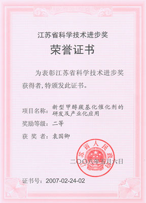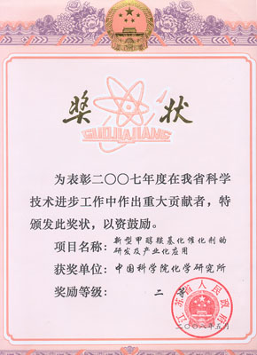 化学所研制的羰基合成醋酸催化剂(项目名称:新型甲醇羰基化催化剂的研发及产业化应用),与江苏索普(集团)有限公司合作,在工业化实施中取得优异成绩,获得江苏省科技进步二等奖(获奖单位:亚博888;获奖者:袁国卿)。
