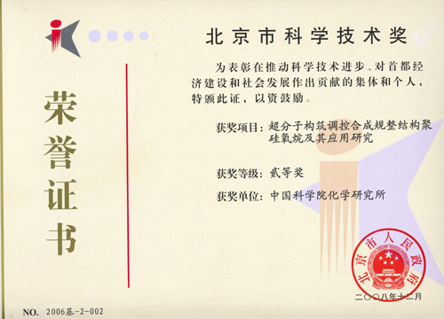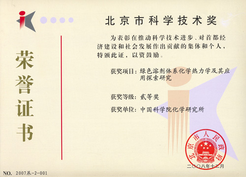 近日,北京市科学技术奖励办公室公布《北京市人民政府关于2006和2007年度北京市科学技术奖励的决定》,我所张榕本研究员等完成的项目“超分子构筑调控合成规整结构聚硅氧烷及其应用研究”和韩布兴研究员等完成的项目“绿色溶剂体系化学热力学及其应用探索研究”分别获得2006年度和2007年度的北京市科学技术奖二等奖。