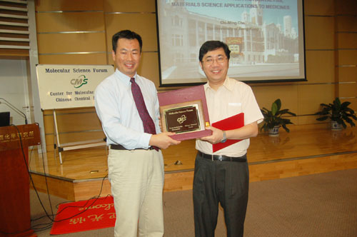 支志明教授于1995年当选中国科学院院士,曾获得2006年度国家自然科学一等奖、2007年度何梁何利奖等多项重大奖项,科研工作涉及无机和有机合成、无机光化学、荧光材料和生物无机化学等多个领域,发表论文620多篇。 报告会后, 支教授与光化学院重点实验室和分子识别与功能院重点实验室的部分科研人员进行了深入探讨。 杨振忠副所长为支院士颁发“分子科学论坛讲座教授”荣誉证书 科技处 2009年9月29日