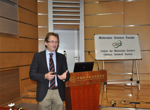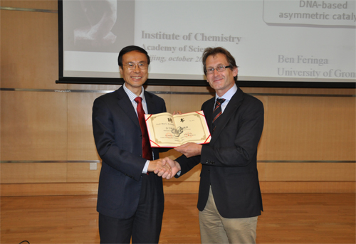 2011年10月13日,荷兰格罗宁根大学Ben L. Feringa教授应邀访问化学所,并作了题为“Exploring Chiral Space in Asymmetric Catalysis”的分子科学论坛报告。张德清副所长主持了报告会,万立骏所长为Feringa教授颁发了“分子科学论坛讲座教授”荣誉证书。