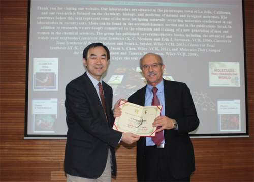 2013年5月17日,美国Scripps研究所K. C. Nicolaou教授访问化学所并作题为“Total Synthesis of Natural and Designed Molecules of Biological and Medical Importance”的分子科学论坛报告。范青华研究员主持了会议,毛兰群副所长为Nicolaou教授颁发了“分子科学论坛讲座教授”荣誉证书和奖牌。