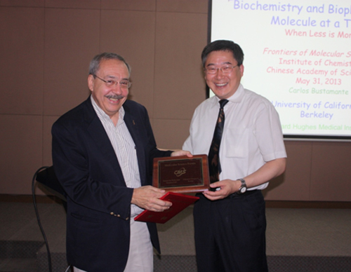 2013年5月31日,美国加州大学伯克利分校物理系Carlos J. Bustamante教授访问化学所并作题为“Biophysics one molecule at a time”的分子科学论坛报告。方晓红研究员主持了会议,杨国强副所长为Bustamante教授颁发了“分子科学论坛讲座教授”荣誉证书和奖牌。