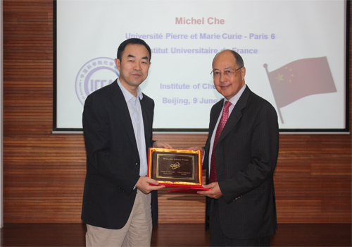 2013年6月9日,法国巴黎居里大学反应和表面化学实验室Michel Che教授访问化学所并作题为“Bridging the gap between homo- and heterogeneous catalysis: solid oxides as supermolecular ligands”的分子科学论坛报告。宋卫国研究员主持了报告会,毛兰群副所长为Michel Che教授颁发了“分子科学论坛讲座教授”荣誉证书和奖牌。