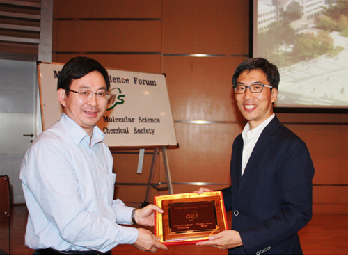 2013年9月6日,韩国延世大学Jinwoo Cheon教授访问化学所并作题为“Design of Magnetic Nanoparticles for Diagnostics and Cell Activations”的分子科学论坛报告,毛兰群副所长主持了会议,张德清所长为Jinwoo Cheon教授颁发了“分子科学论坛讲座教授”荣誉证书和奖牌。