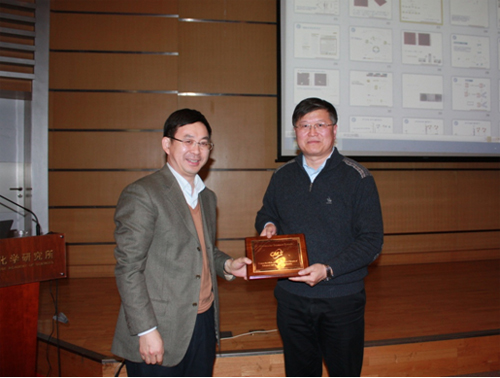 2013年12月11日,华东理工大学化学与分子工程学院院长田禾院士访问化学所并作题为“Light-driven Interlocked Functional Supramolecules”的分子科学论坛报告,毛兰群副所长主持了会议,张德清所长为田禾院士颁发了“分子科学论坛讲座教授”荣誉证书和奖牌。