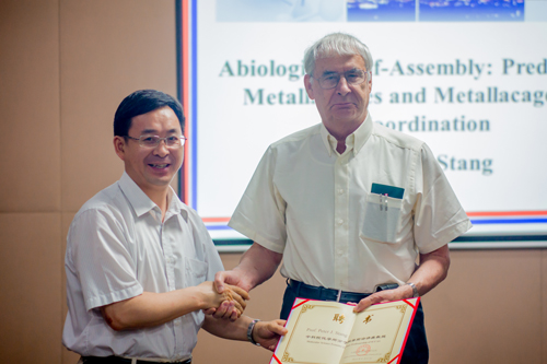 2014年6月6日,美国犹他大学Peter J. Stang教授访问化学所,并作题为“Abiological Self-Assembly: Predesigned Metallacycles and Metallacages via Coordination”的分子科学前沿讲座报告,报告由所长助理范青华研究员主持,张德清所长为Stang教授颁发了“分子科学前沿讲座教授”荣誉证书。