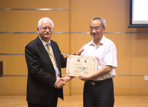 2014年6月9日,法国巴黎高等师范学院(Ecole Normale Superieure) Christian Amatore教授在参加中国科学院第十七次大会期间访问化学所,并作题为“Mechanism of Brain Vascularization: Coupling Between Oxidative Stress and Neurotransmissionas Investigated by Ultramicroelectrodes”的分子科学论坛报告,报告由杨国强副所长主持,王笃金副所长为Amatore教授颁发了“分子科学论坛教授”荣誉证书和奖牌。此次报告是受中国科学院第十七次院士大会——学部第四届学术年会的邀请,并由我所分子科学报告论坛组织实施。