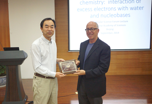 2014年9月12日,美国加州大学伯克利分校(University of California, Berkeley)Daniel M. Neumark教授访问化学所,并作题为“Time-resolved radiation chemistry: interaction of excess electrons with water and nucleobases”的分子科学论坛报告,报告由苏红梅研究员主持,毛兰群副所长为Neumark教授颁发了“分子科学论坛”荣誉证书和奖牌。