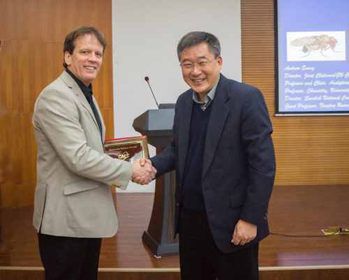 2014年10月21日,瑞典哥德堡大学(University of Gothenburg)Andrew Ewing教授访问化学所并作分子科学论坛报告,并作题为“Small sensors and single cells: zeptomoles, milliseconds, and the nature of reality in neurotransmission”的分子科学论坛报告,报告由毛兰群副所长主持,杨国强副所长为Andrew Ewing教授颁发了“分子科学论坛”荣誉证书和奖牌。