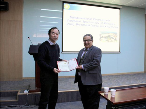 2015年11月17日,美国加利福尼亚大学Shaul Mukamel教授应邀访问化学所,并作题为“Multidimensional Electronic and Vibrational Spectroscopy of Molecules Using Optical Pulses, X-ray Pulses, and Quantum Light” 的分子科学前沿讲座。报告由王建平研究员主持,毛兰群副所长为Mukamel教授颁发了“分子科学前沿讲座教授”荣誉证书。