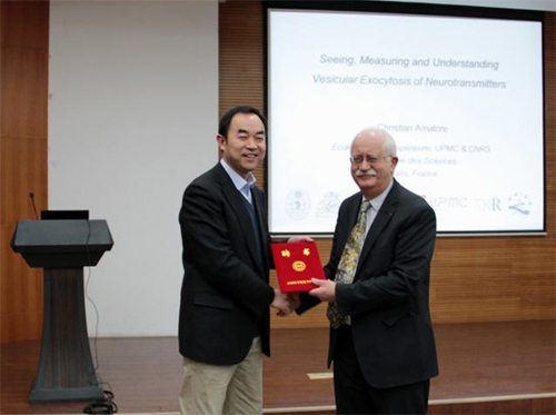 2016年3月23日,法国巴黎高师(Ecole Normale Superieure) Christian Amatore教授访问化学所,并作题为“Seeing, Measuring and Understanding Vesicular Exocytosis of Neurotransmitters with ‘Artificial Synapses’”的分子科学前沿讲座。报告由何圣贵研究员主持,毛兰群副所长为Christian Amatore教授颁发了“分子科学前沿讲座教授”荣誉证书。