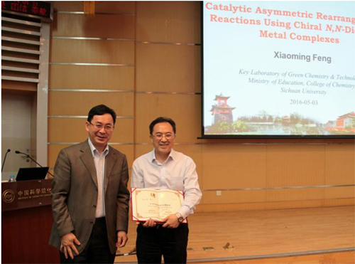 2016年5月3日,四川大学冯小明院士应邀访问化学所并作题为“手性双氮氧金属配合物催化不对称重排反应”的分子科学论坛报告。报告由化学所副所长范青华主持,化学所所长张德清为冯小明院士颁发了“分子科学论坛”荣誉证书和奖牌。
