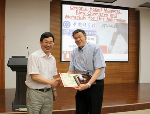 2016年6月23日,美国犹他大学Joel S. Miller教授访问化学所并作题为“Organic-based Magnets: New Chemistry and New Materials for This Millennium“分子科学论坛报告。报告由化学所副所长毛兰群主持,化学所所长张德清为Miller教授士颁发了“分子科学论坛”荣誉证书和奖牌。