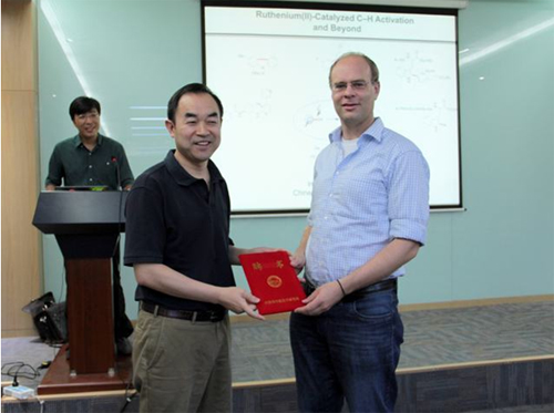 2016年7月14日,德国哥廷根大学Lutz Ackermann教授访问化学所并作题为“Ruthenium(II)-Catalyzed C–H Activation and Beyond”的分子科学前沿讲座。讲座由化学所研究员王从洋主持,化学所副所长毛兰群为Ackermann教授颁发了“分子科学前沿讲座”荣誉证书。