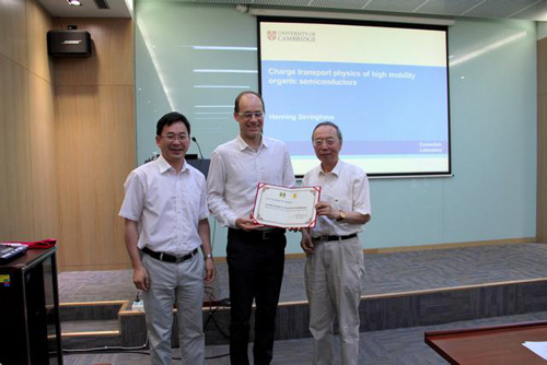 2016年7月15日,英国剑桥大学Henning Sirringhaus教授访问化学所并作题为“Charge Transport Physics of High Mobility Organic Semiconductors”的分子科学前沿讲座,讲座由化学所所长张德清主持,化学所朱道本院士为Sirringhaus教授颁发了“分子科学前沿讲座”荣誉证书。