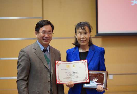 张德清所长为杨秀荣院士颁发“分子科学论坛”荣誉证书和奖牌 |