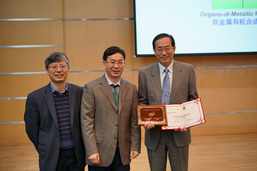 2016年10月20日,北京大学化学院席振峰院士访问化学所并作题为“双金属有机合成试剂化学:协同效应与深新信”的分子科学论坛报告,报告由副所长范青华主持,化学所所长张德清为席振峰院士颁发了“分子科学论坛”荣誉证书和奖牌。