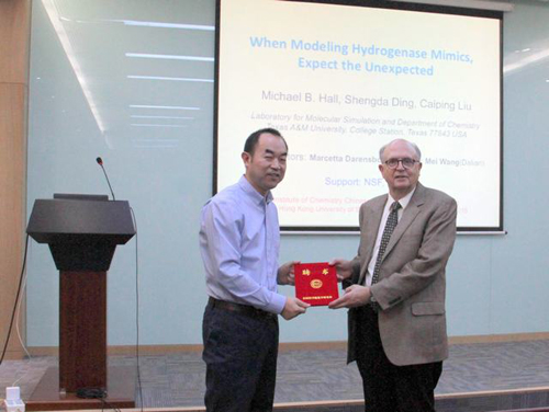 2016年10月20日,美国德克萨斯A&M大学Michael B. Hall教授访问化学所并题为“When Modeling Hydrogenase Mimics, Expect the Unexpected”的分子科学前沿讲座,讲座由化学所杨新征研究员主持,化学所副所长毛兰群为Michael B. Hall教授教授颁发了“分子科学前沿讲座”荣誉证书。