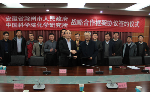 2017年3月11日上午,安徽省滁州市市长张祥安、副市长杨东坡等一行6人访问化学所洽谈战略合作事宜。化学所党委书记王笃金,工程塑料实验室主任阳明书、副主任张军,杰事杰集团董事长杨桂生,及工程塑料、高技术材料实验室相关科研人员,科技处、人事处管理人员参加了会议。