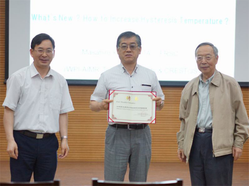 2017年5月8日,日本东北大学Masahiro Yamashita教授访问化学所并作题为Quantum Molecular Spintronics Based on Single-Molecule Magnets: What is New? How to Increase Hysteresis Temperature? 的分子科学前沿讲座,讲座由化学所所长张德清主持,张德清所长及朱道本院士为Masahiro Yamashita教授颁发了“分子科学前沿讲座”荣誉证书。
