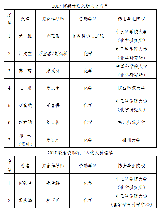 近日,全国博士后管理委员会办公室和中国科学院分别公布了2017年度“博士后创新人才支持计划”(简称“博新计划”),以及 “支持‘率先行动’中国博士后科学基金会与中国科学院联合资助优秀博士后项目”(简称“联合资助项目”)获选人员名单。