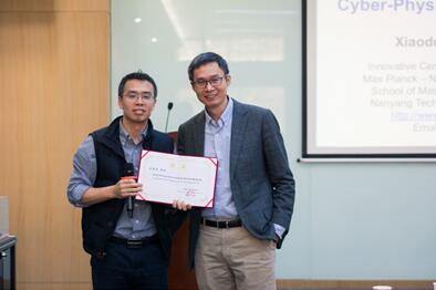 2018年11月19日,南洋理工大学陈晓东教授访问化学所,并作题为“Cyber-Physiochemical Interfaces”的分子科学前沿讲座报告,王铁研究员主持报告并为陈晓东教授颁发了“分子科学前沿讲座教授”荣誉证书。