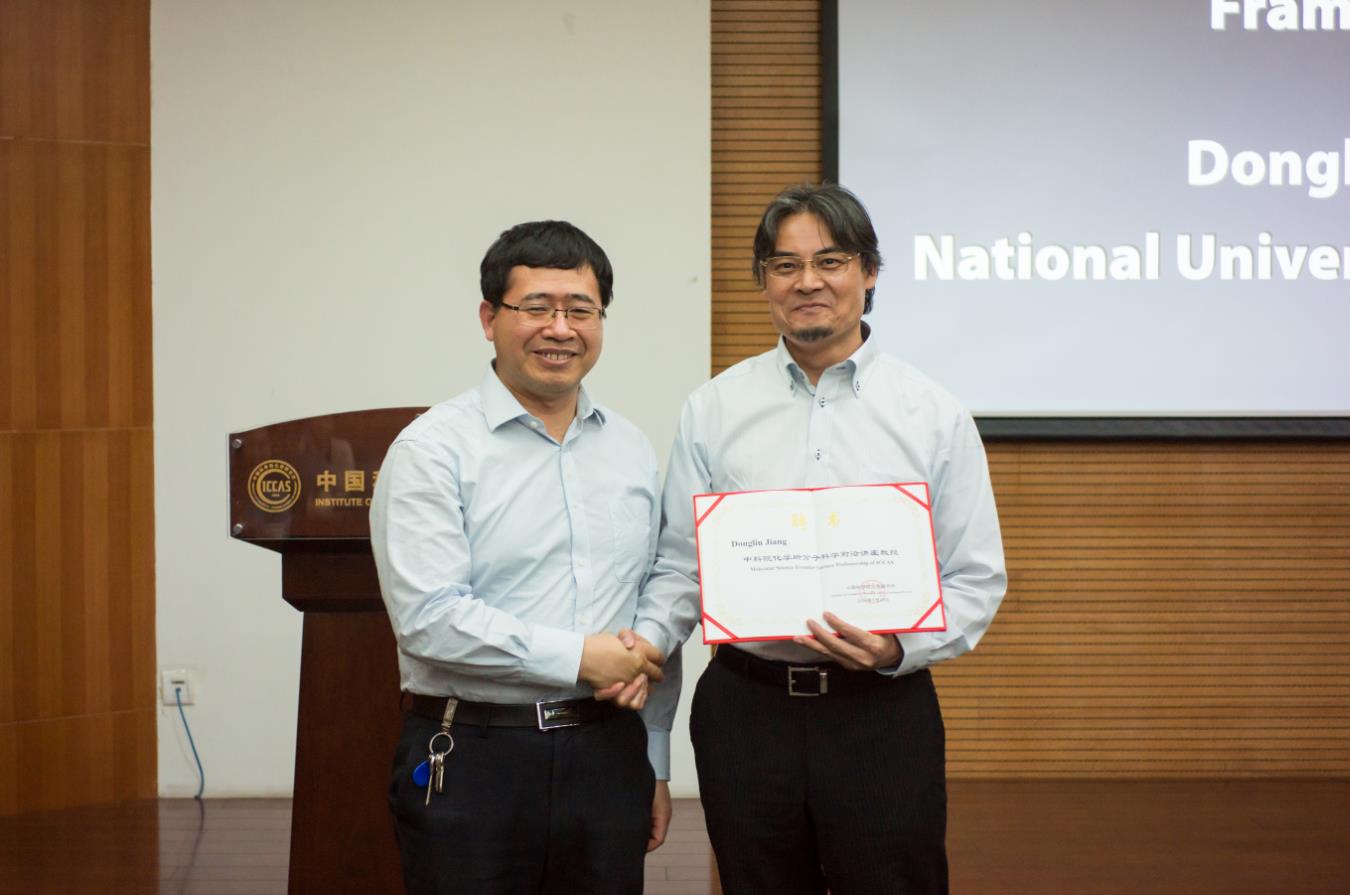 2019年5月10日,新加坡国立大学(National University of Singapore)江东林教授访问化学所,并作题为“The Chemistry of Covalent Organic Frameworks”的分子科学前沿讲座。讲座由王其强研究员主持,所长助理王树研究员为江东林教授颁发了“分子科学前沿讲座”荣誉证书。