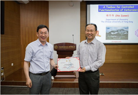 2019年5月30日,香港中文大学谢作伟院士访问化学所,并作题为“A Toolbox for Controlled Functionalization of Carboranes”的分子科学论坛报告。张德清所长主持报告并为谢院士颁发了“分子科学论坛”荣誉证书和奖牌。