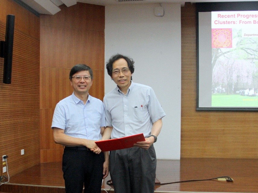 2019年7月1日,美国布朗大学(Brown University)王来生教授访问化学所,并作题为“Recent Progress in the Investigation of Size-Selected Boron Clusters: From Borophenes to Metallo-Borophenes”的分子科学前沿讲座。报告由何圣贵研究员主持,范青华副所长为王教授颁发了“分子科学前沿讲座”荣誉证书。