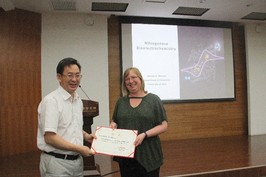 2019年8月19日,美国犹他大学(University of Utah)Shelley D. Minteer教授访问化学所,并作题为“Developing Electroanalytical Techniques For Evaluating Nitrogenase Thermodynamics And Mechanisms”的分子科学前沿讲座。讲座由毛兰群研究员主持,张德清所长为Shelley D. Minteer教授颁发了“分子科学前沿讲座”荣誉证书。