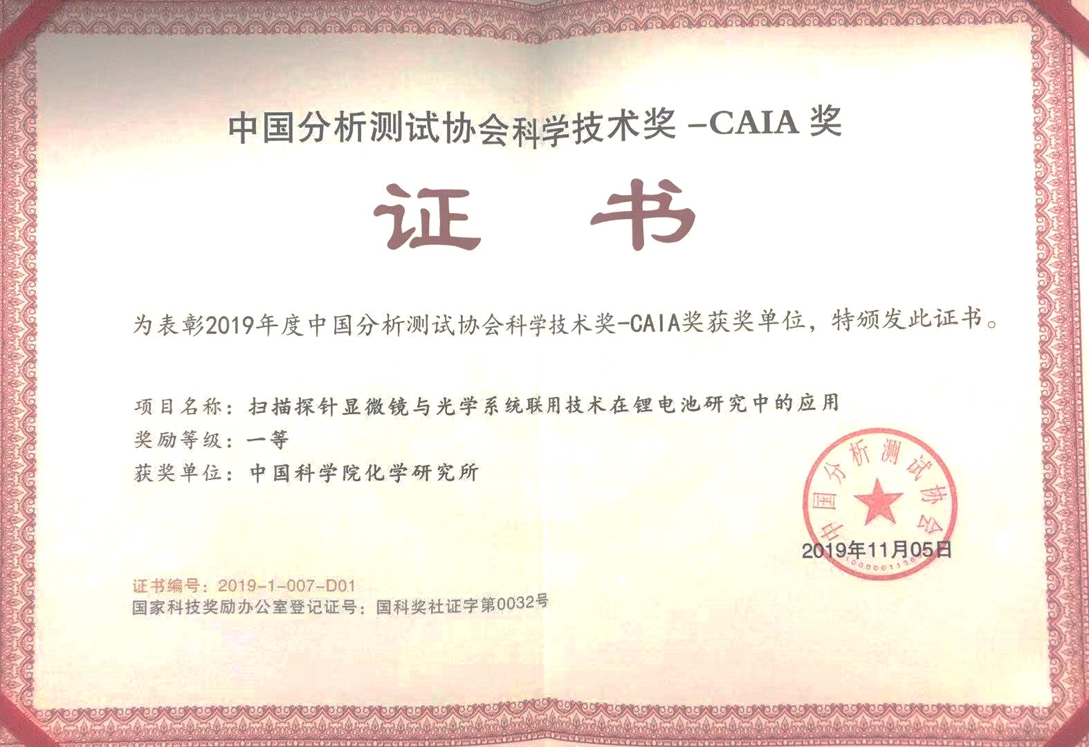 2019年 “中国分析测试协会科学技术奖(CAIA奖)”评选结果已揭晓,化学所有两项成果获得一等奖,分别为“扫描探针显微镜与光学系统联调技术在锂电池研究中的应用”(文锐、郎双雁、施杨、万立骏)和“颗粒质谱与成像”(聂宗秀、熊彩侨、刘会会)。