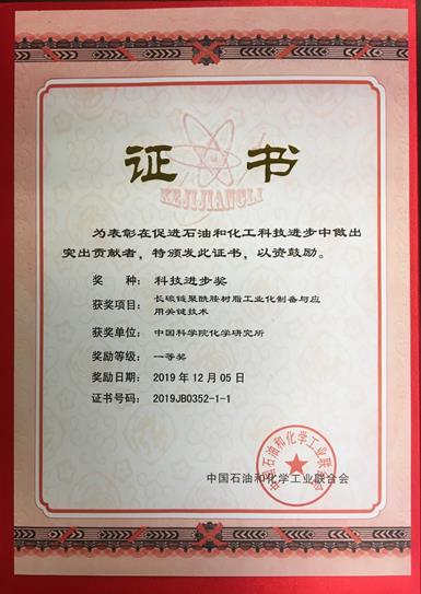 2019年12月10日,中国石油和化学工业联合会在北京召开“全国石油和化工科技创新大会”。大会隆重表彰2019年度我国石油和化工行业科技创新的先进单位和个人,化学所与山东广垠新材料有限公司、军事科学院系统工程研究院军事新能源技术研究所共同完成的项目“长碳链聚酰胺树脂工业化制备与应用关键技术”,获得“中国石油和化学工业联合会科技进步一等奖”(主要完成人:董侠,王笃金,刘其永,李万利,徐忠波,崔强,刘进立,房永民,王莉莉,常山林,刘国明,南洋,赵莹,周勇,刘学新)。