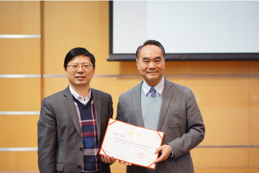 2019年12月26日,美国德克萨斯理工大学李桂根教授访问化学所,并作题为“GAP Chemistry and Multi-Layer 3D Chirality”的分子科学前沿讲座。讲座由陈传峰研究员主持,范青华副所长为李桂根教授颁发了“分子科学前沿”荣誉证书。