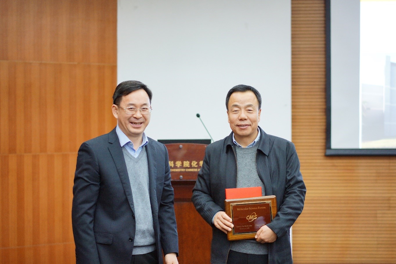 2020年1月10日,中科院上海药物所岳建民院士访问化学所,并作题为“重要生物活性天然分子的发现与研究”的分子科学论坛报告。报告由范青华副所长主持,张德清所长为岳建民院士颁发了“分子科学论坛”荣誉证书和奖牌。