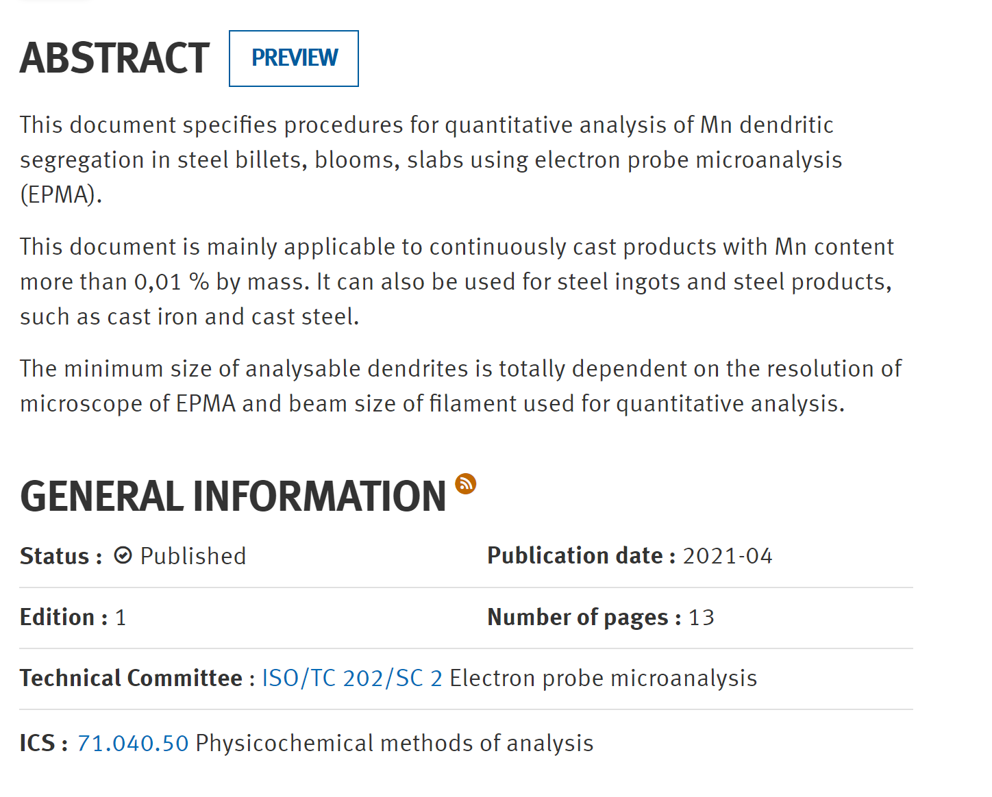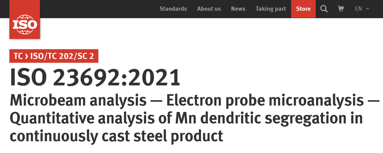 由首钢集团有限公司、钢研纳克检测技术股份有限公司、亚博888和中国有色桂林矿产地质研究院有限公司主导制定的国际标准《微束分析—电子探针分析—钢坯中锰枝晶偏析的定量分析》(Microbeam analysis — Electron probe microanalysis — Quantitative analysis of Mn dendritic segregation in continuously cast steel product,标准编号 ISO 23692:2021)于2021年4月由国际标准化组织(ISO)正式发布实施。