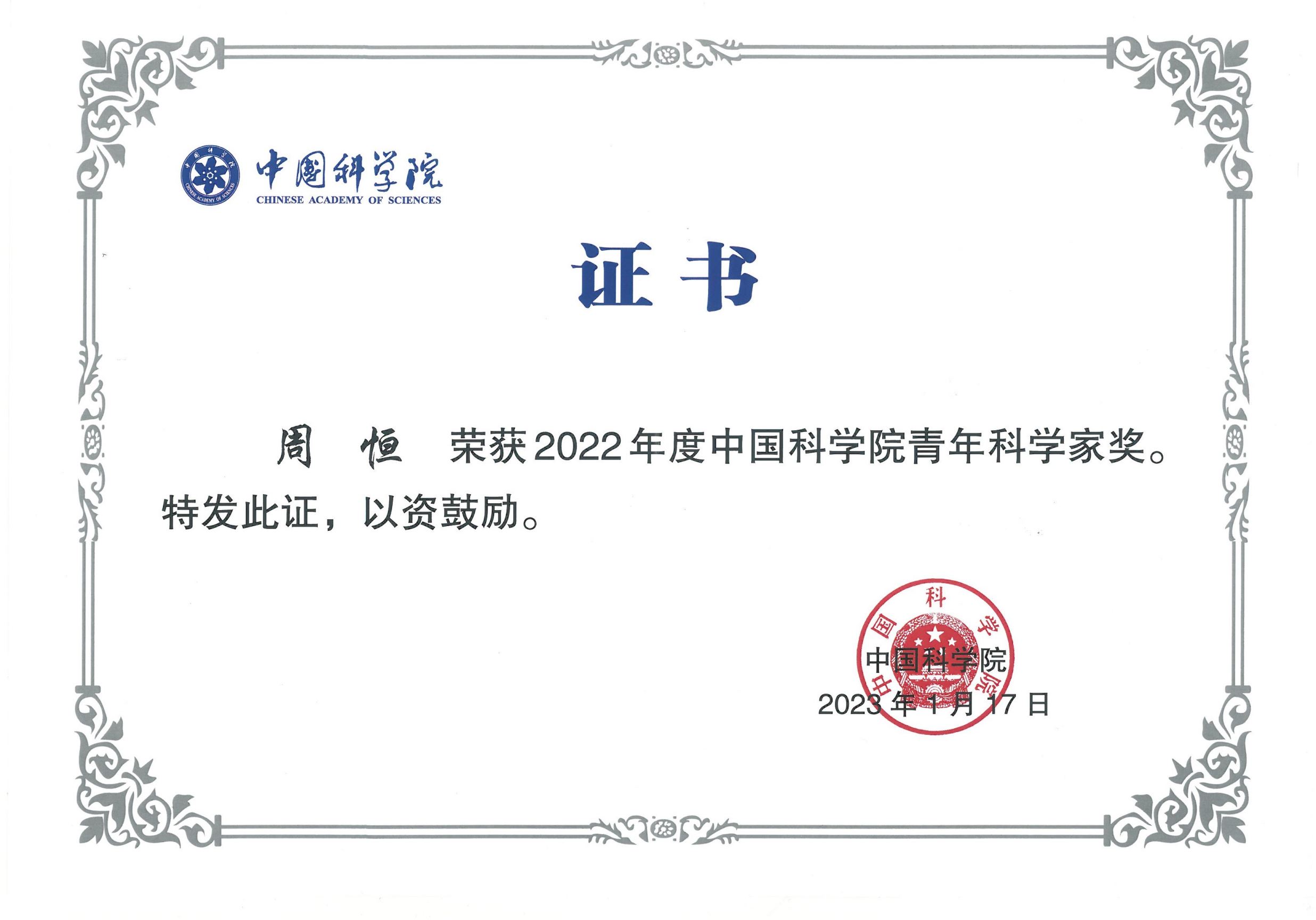 2023年2月11日,中国科学院召开2023年度工作会议,会上隆重表彰了2022年度全院20位中国科学院青年科学家奖获得者。