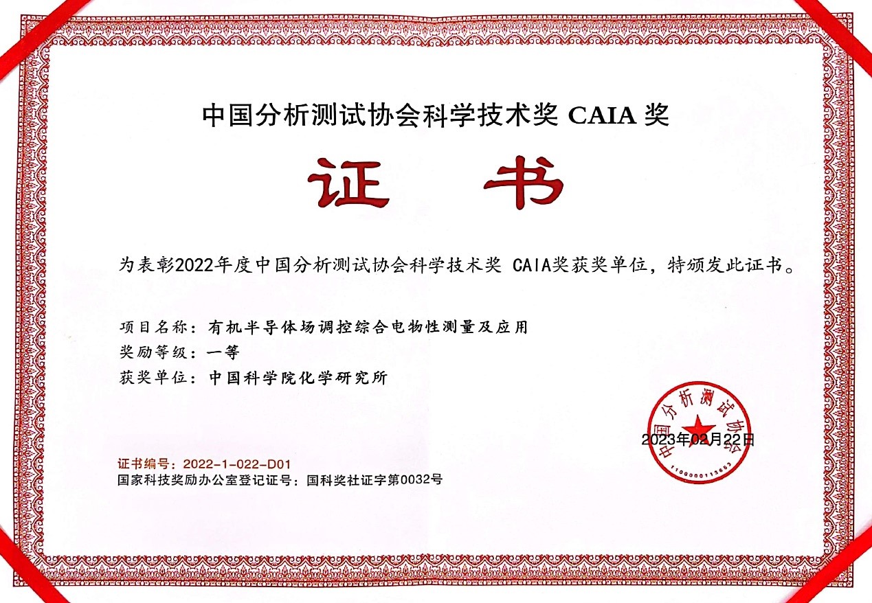 近日,中国分析测试协会公布了2022年度“中国分析测试协会科学技术奖(CAIA奖)获奖名单,化学所完成的研究成果“有机半导体场调控综合电物性测量及应用”(完成人:狄重安、邹业、张凤娇、臧亚萍、刘力瑶、贺紫晗、朱道本)荣获一等奖。